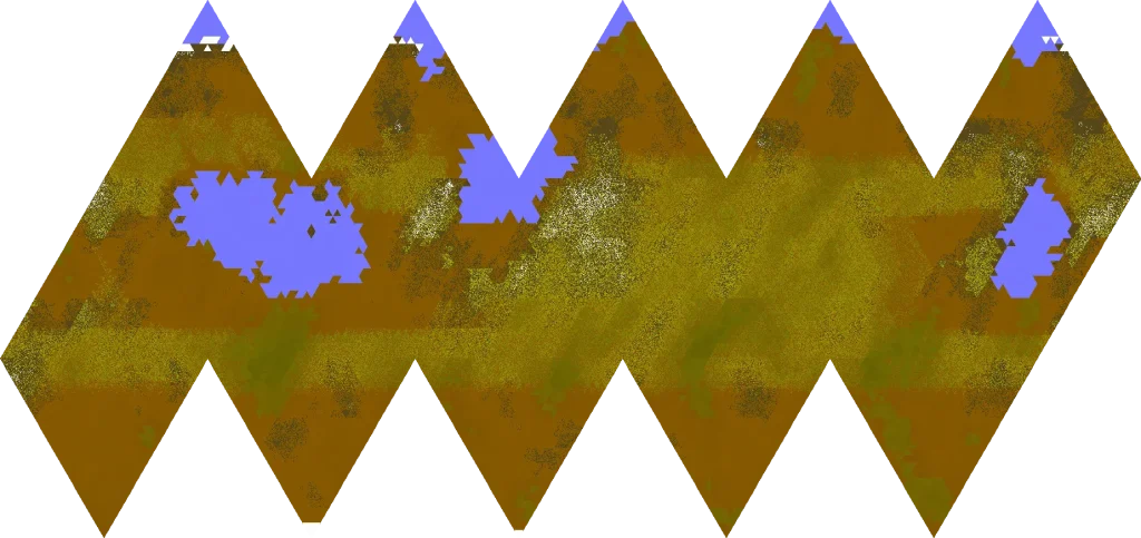A closer look at the planet shows signs of previous habitation. The real problem I have with the time scales involved is that very probably there wouldn’t be anything left after 300,000 years. For game reasons though, I’ve allowed there to be some things left. The pile of nuclear material in an old fission reactor is something that would survive. The outlines of a city just off the coast maybe not. But there’s enough to pick up the patterns of walls and streets.