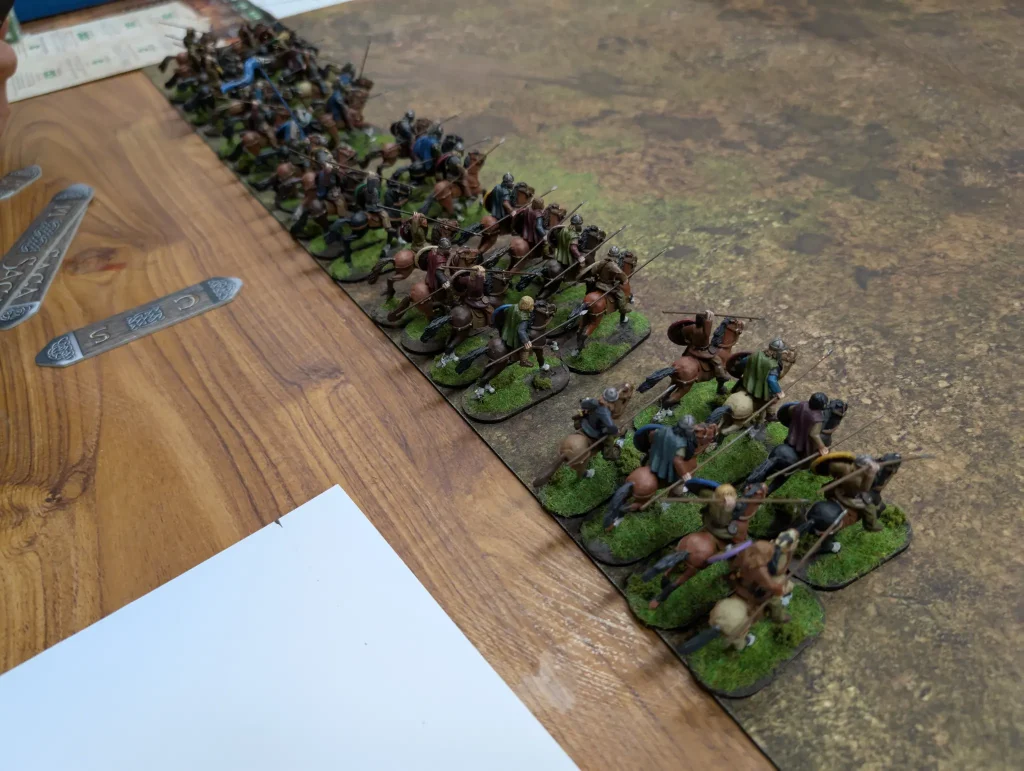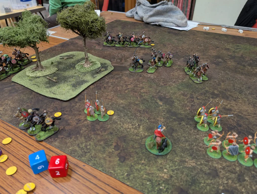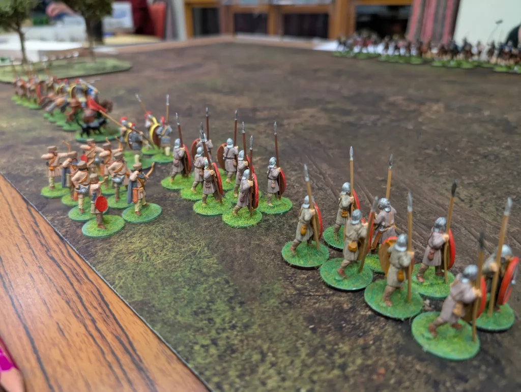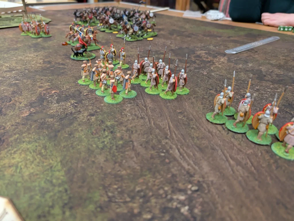 The scenario is relatively simple (get across the table), but the Barbarians need to decide whether to go for short term victory (and get many across as possible) or long term wearing down the Romans (by killing as many Romans as possible). After the first battle, the Romans are in a quite good state, and can hopefully build up their numbers next year.