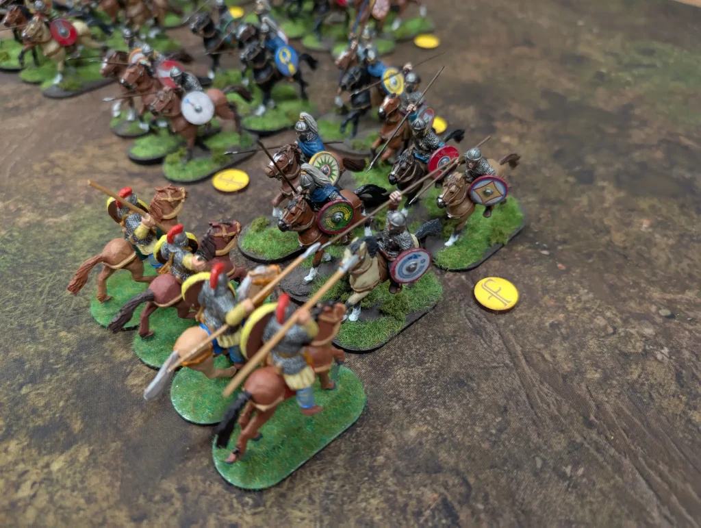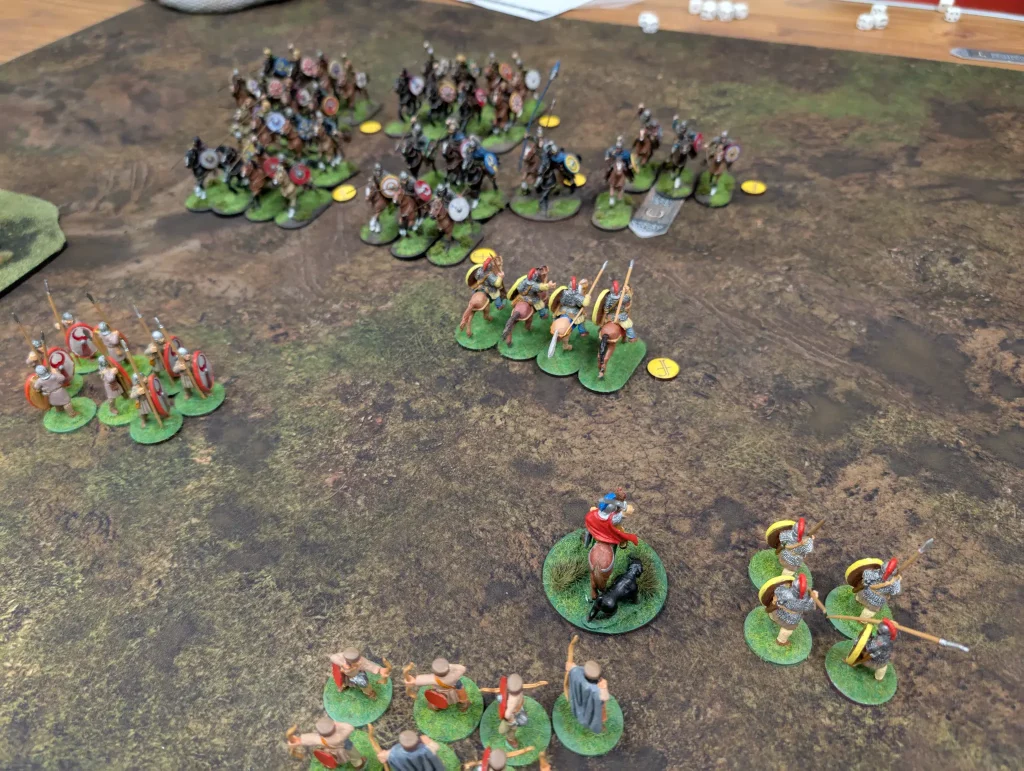 The first turn began badly for the Romans. I reached across the table and my jumped caught in my Warlord’s sword. The figure was hurled off the table and onto the floor, where the horse came off its base, and the figure off the horse. Fortunately it just broke at the glue joins, and it balanced together well enough to continue the game with.
