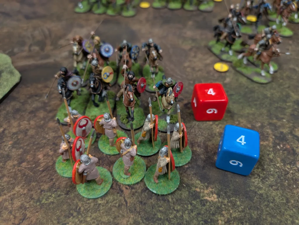 The Goth Hearthguards then charged my warriors, who closed ranks. All four of the Roman infantry were slain though they took down two hearthguard with them. The Roman Warlord gained a fatigue since he was within short of the wiped unit. Another two points to me, but I’d lost an entire unit.