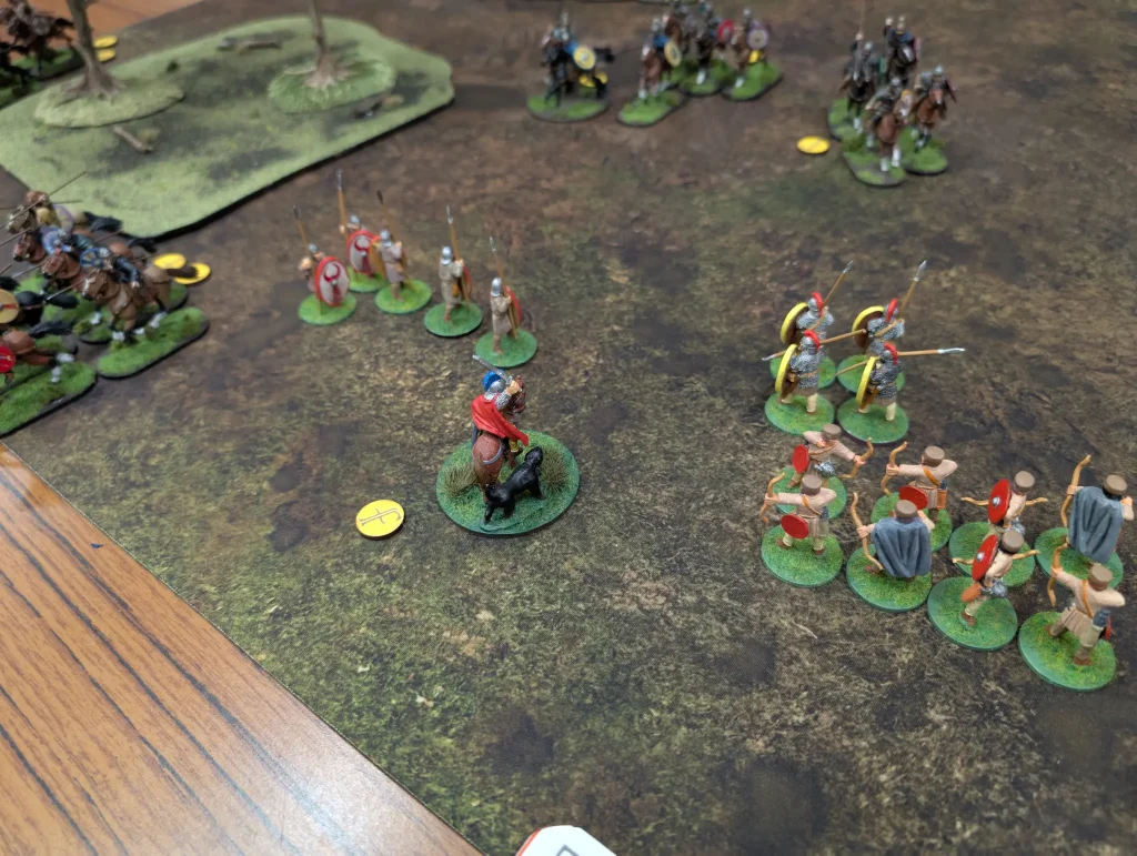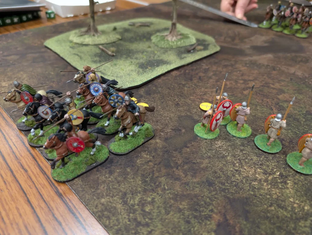 The second unit to activate was a group of Goth warriors, which charged the Roman infantry holding the line by the woods. The Romans closed ranks, but three were killed and forced back.