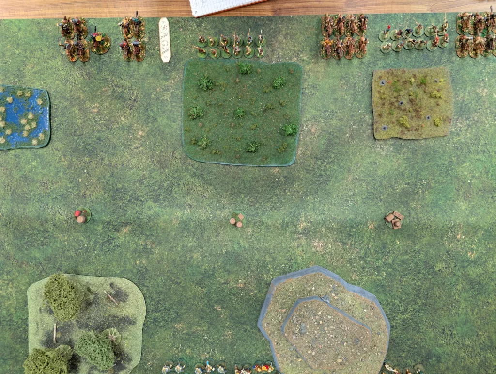 We went for the Feasting and Pillaging scenario from the Book of Battles. This would actually be bad for my Welsh. There were three objectives along the centre line of the table, and we had to grab them and take them back to our table edge. Getting to the objectives would be quick on horse, but carrying an objective counts as uneven terrain, so I’d then be moving Short, and also taking fatigue each time I moved.