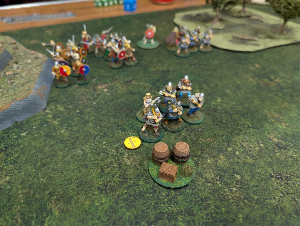 The Anglo-Danes went first with three saga dice. They didn’t do much other than move forward. They didn’t quite grab the first objective with a unit of six hearthguard, but were close to it, taking control of the middle of the table.
