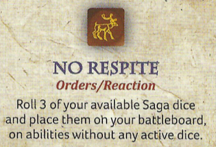 The Danes had a full set of dice. The Scots played No Respite as an Order/Reaction, which allowed them to put three dice on their battleboard, and I played Exhaustion, putting a fatigue marker down on three Scottish units.