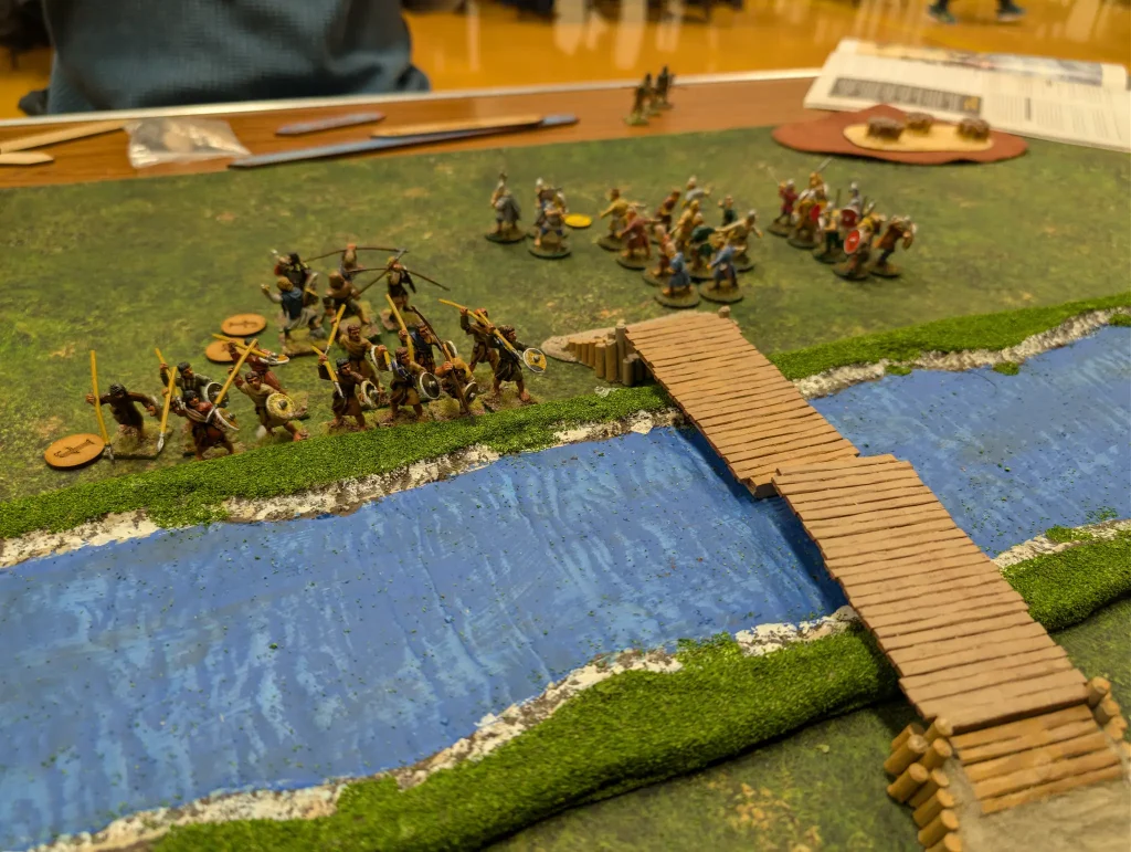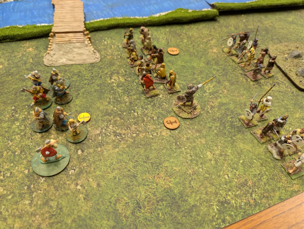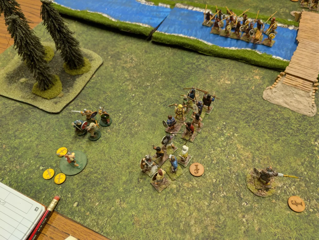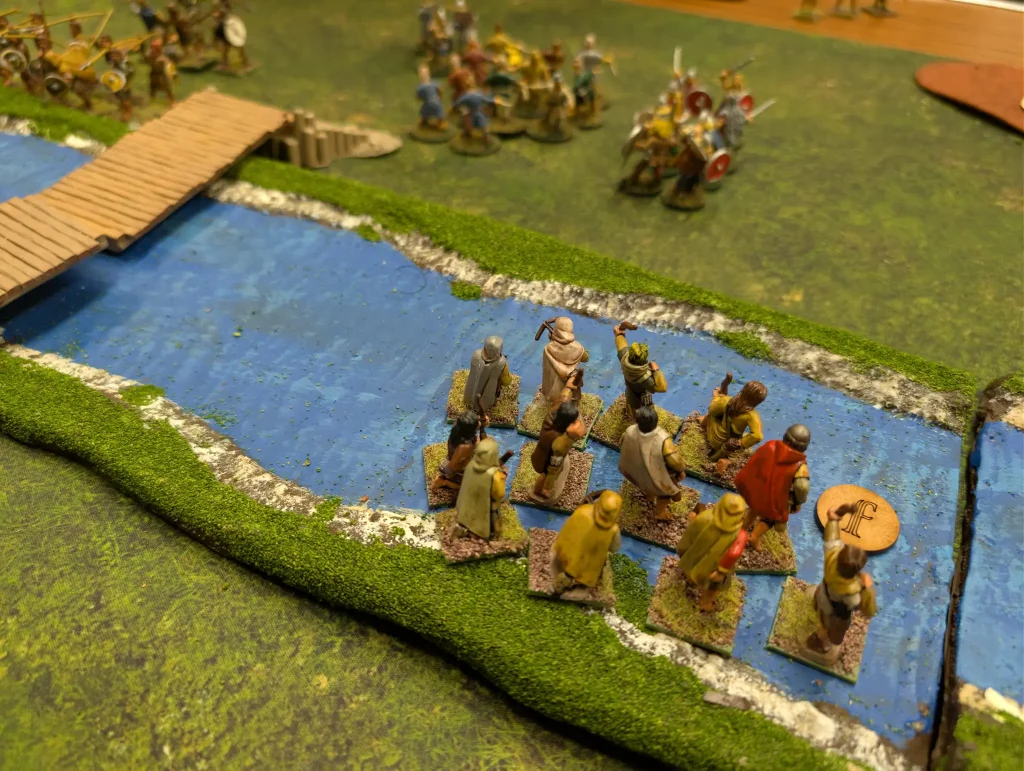The Danes responded by moving their hearthguards up on the northern bank, and shooting with the slingers, killing one of the warriors. I then had a cunning plan, which I cocked up.