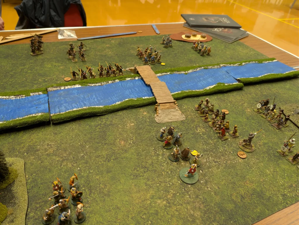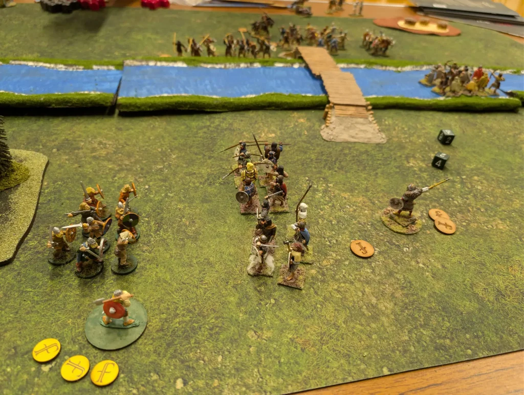 The Scots had only three Saga dice in the first turn, but managed to move their Eastern levee towards the bridge with a We Obey, and shot at my hearthguard. They got a hit, but no casualties.