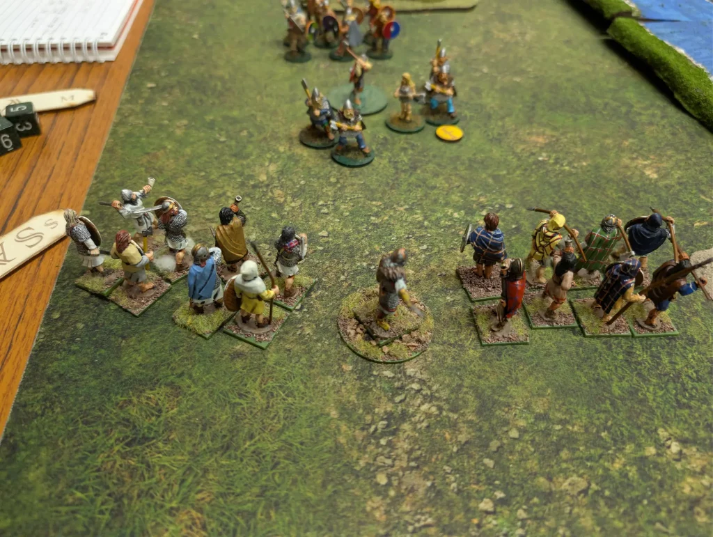 Then my hearthguard in the south went on the move. I had my warlord flanked by two units of 4 hearthguard, and they were all out in the open. This was a bit risky, but I decided I wanted to be aggressive and try and hurt the Scots early on. So I charged in against the levee bowmen with my hearthguard. They already had two fatigues, and as levee only had 4 attack dice to my 8.