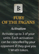 The Irish also have some good movement abilities, but not as many. If I was willing to take the risk of having activations cancelled for wrath tokens, just sticking “birch” on Fury of the Pagans (which is a basic ability, so I can put multiple dice on there) would allow a ridiculous number of activations of any type. Though I didn’t think of it, I could also use it to rest my units.