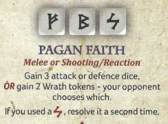 I also played Pagan Faith with an ‘yew’ symbol, meaning I get +3 dice unless my opponent decides to cancel it (giving me two wrath tokens). Then I get to resolve it a second time. I was allowed to take the +3 attack dice the first time, but the Irish gave me wrath tokens for the second time.