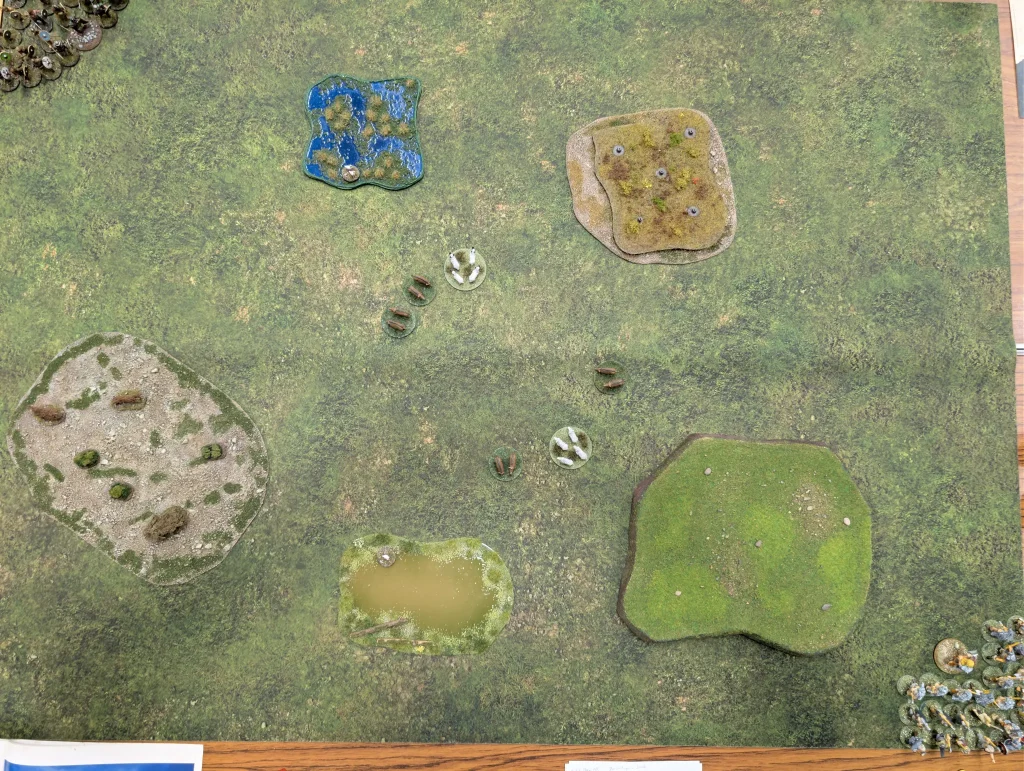 The Jomsvikings got to go first, which is bad when going up against the Irish who want to have lots of terrain. So we ended up with five terrain pieces. However, I put down a large hill in my starting corner, which nullified a lot of the Irish abilities.