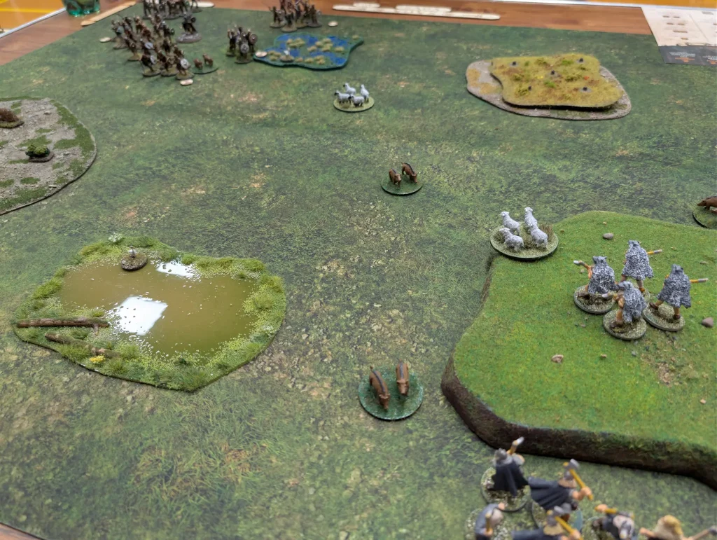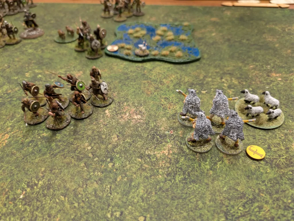 The Jomsvikings had one base of livestock off the table, and were able to get a further three units off early in the turn. I moved my forward units back to not lose any more, and started moving a fifth base of livestock in my direction as well.