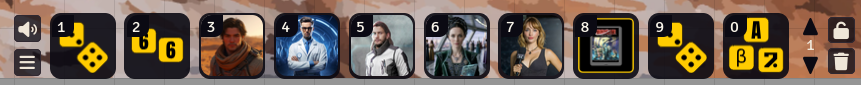 I’ve got links all the main actors on the hot bar along the bottom of the screen, as well as macros for rolling 2D6 (1), D66 (2), opening the core rule book (8), running the skill request macro (9) and random name generator (0).